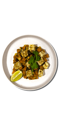 Spicy jerk marinated tofu with sweet potato, spinach , and kidney beans.
