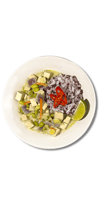 Creamy coconut milk curry with cauliflower & plant-based chick’n, with rice.